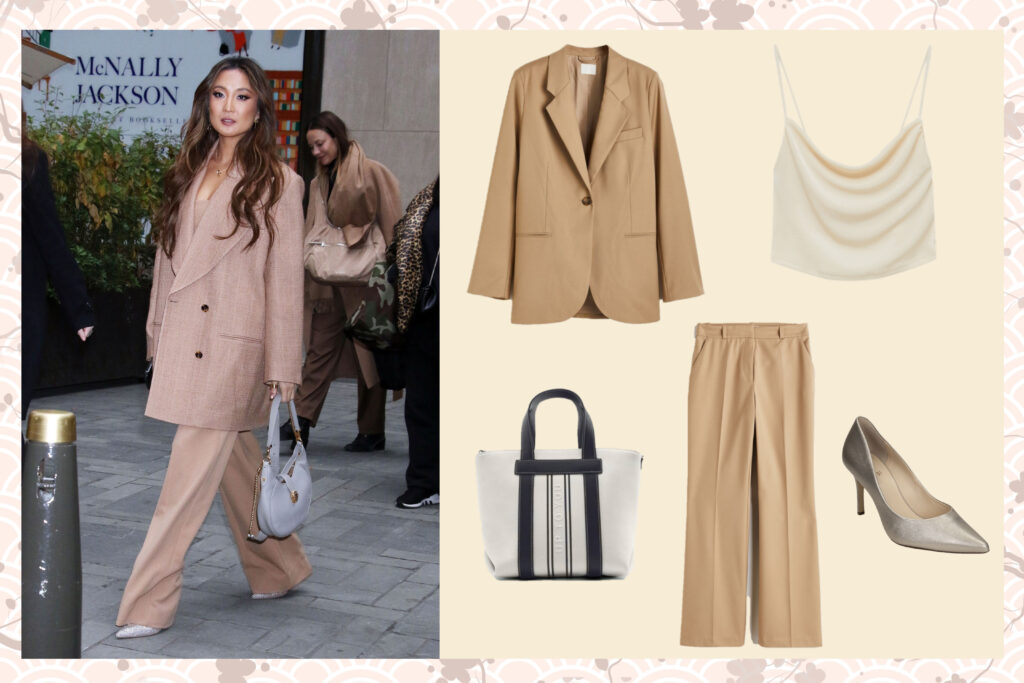 Ashley Park cestou na rozhovor na NBC Today Show. Pro takový outfit nakupte: Kalhoty s širokými nohavicemi, H&M, hm.com, 799 Kč; Béžové sako, H&M, hm.com, 999 Kč; Crop top, Pull & Bear, pullandbear.com, 199 Kč; Kabelka tote, Zara, zara.com, 499 Kč; Kožené lodičky, Högl, bata.cz, 4.599 Kč