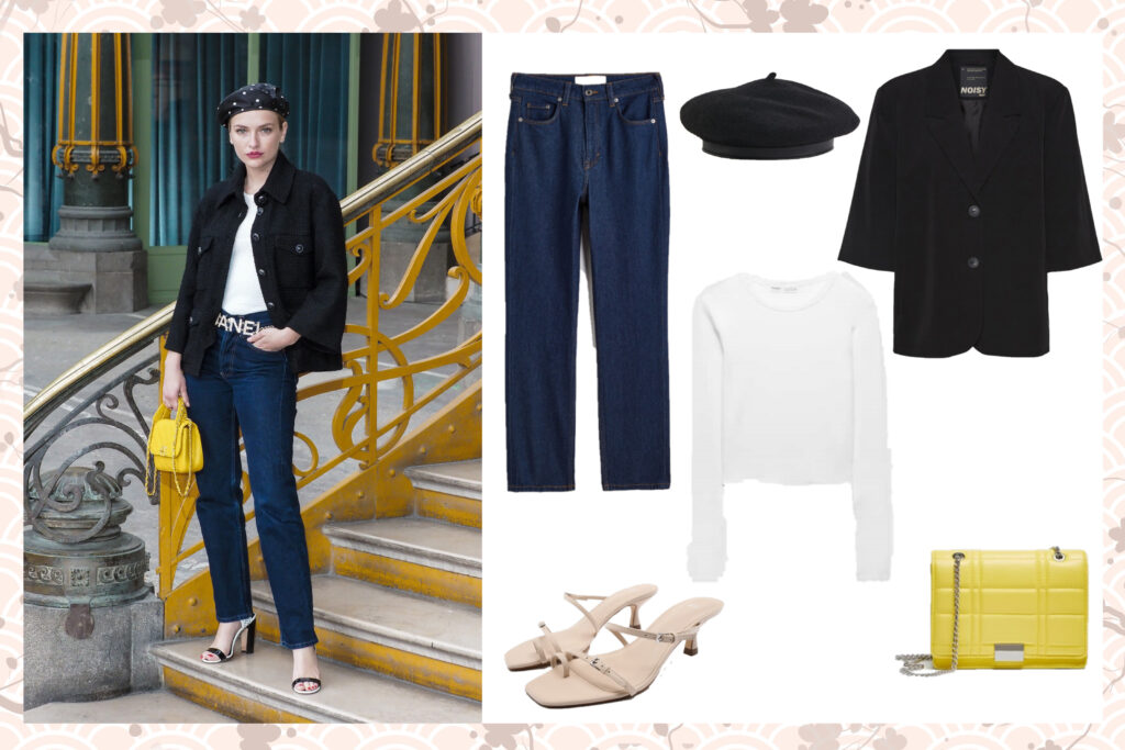 Pokud chcete vypadat jako Camille Razat na přehlídce Chanel: Tričko s dlouhým rukávem, Pull & Bear, pullandbear.com, 249 Kč; Džíny Slim High Ankle, H&M, hm.com, 899 Kč; Černé sako Noisy May, zoot.cz, 729 Kč; Kabelka s řetízkovým popruhem, Pull & Bear, pullandbear.com, 299 Kč; Páskové sandálky, Zara, zara.com, 799 Kč; Vlněný baret, H&M, hm.com, 329 Kč