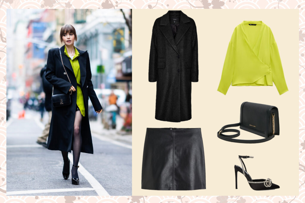 Outfit, ve kterém byla Lily Collins zachycena v ulicích New Yorku. Podobný si můžete poskládat: Koženková minisukně, H&M, hm.com, 599 Kč; Košile s překřížením, Zara, zara.com, 399 Kč; Černý kabát s příměsí vlny Vero Moda, zoot.cz, 1.599 Kč; Černé dámské lodičky Steve Madden, zoot.cz, 2.559 Kč; Černá kožená crossbody kabelka Michael Kors, zoot.cz, 4.975 Kč;