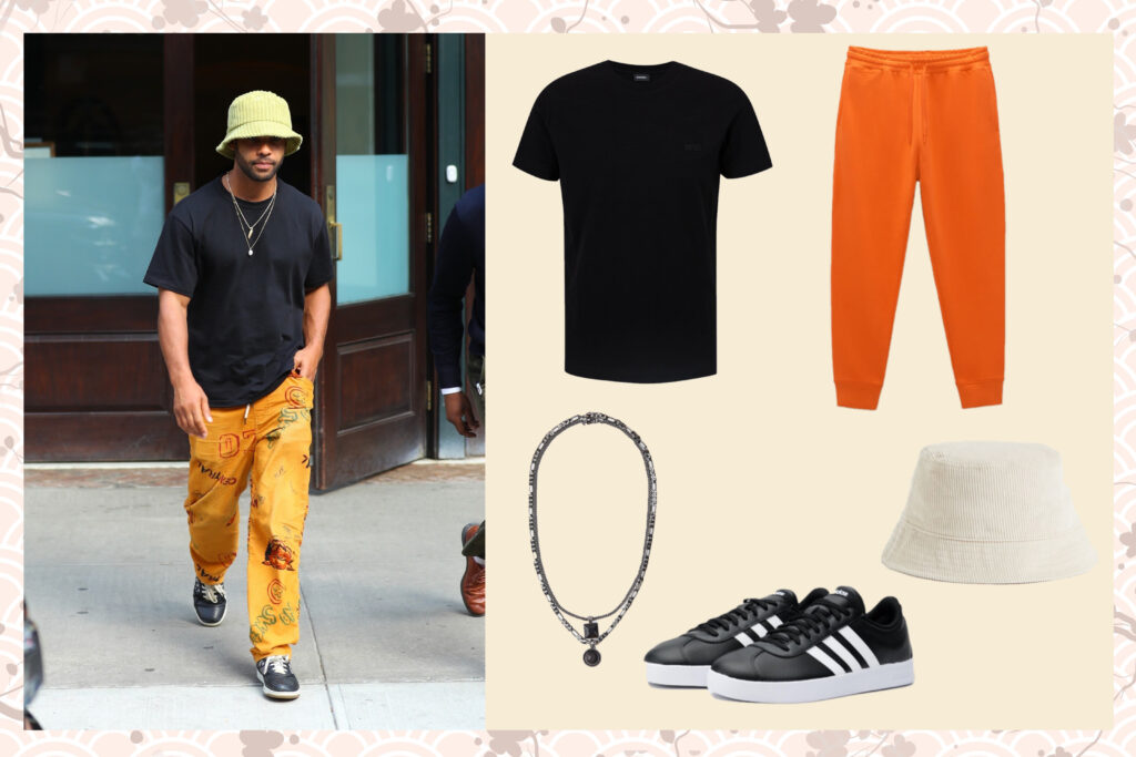 Lucien Laviscount odchází z hotelu Greenwich. Chcete-li vypadat podobně, potřebujete: Černé pánské basic tričko Diesel, zoot.cz, 659 Kč; Kalhoty jogger, Zara, zara.com, 399 Kč; Náhrdelníky s přívěskem, H&M, hm.com, 299 Kč; Manšestrový bucket klobouk, H&M, hm.com, 299 Kč; Sportovní obuv adidas, ccc.eu, 1.279 Kč