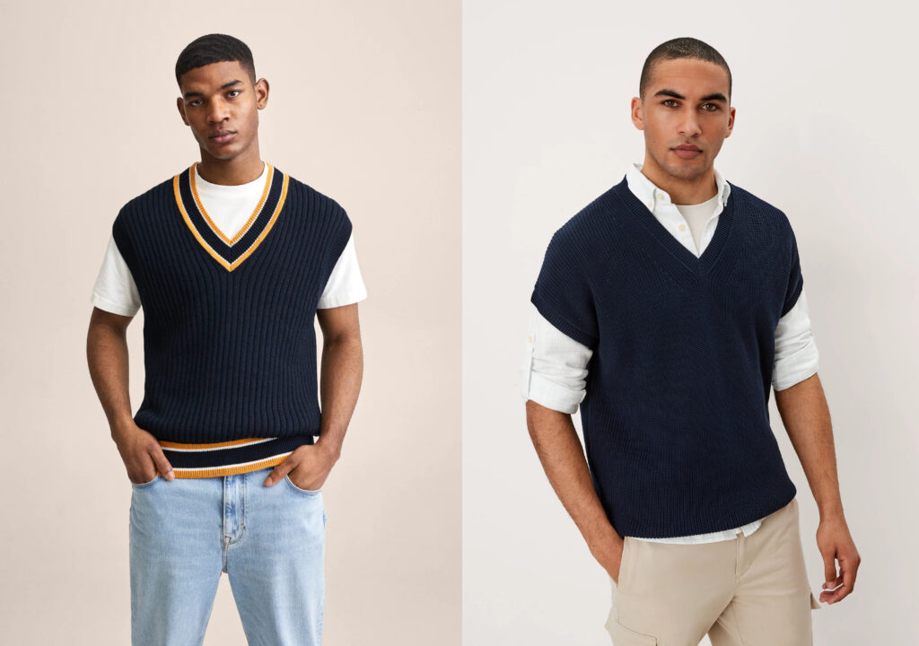 V pánských kolekcích figurují vesty s výstřihem do véčka. Protože jsou součástí preppy stylu, který se letos objevil mezi hlavními trendy, snadno je zkombinujete s ostatními prvky univerzitního looku. Spolu s polo tričkem a chino kalhotami bude pletená vesta vždy vypadat skvěle. Muži, kteří se nebojí módních experimentů, mohou vsadit na kousek v oversized střihu, který obléknou přes sportovní mikinu. Hitem jsou rovněž modely s výraznými vzory a nepřehlédnutelným lemováním.