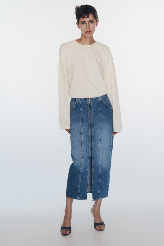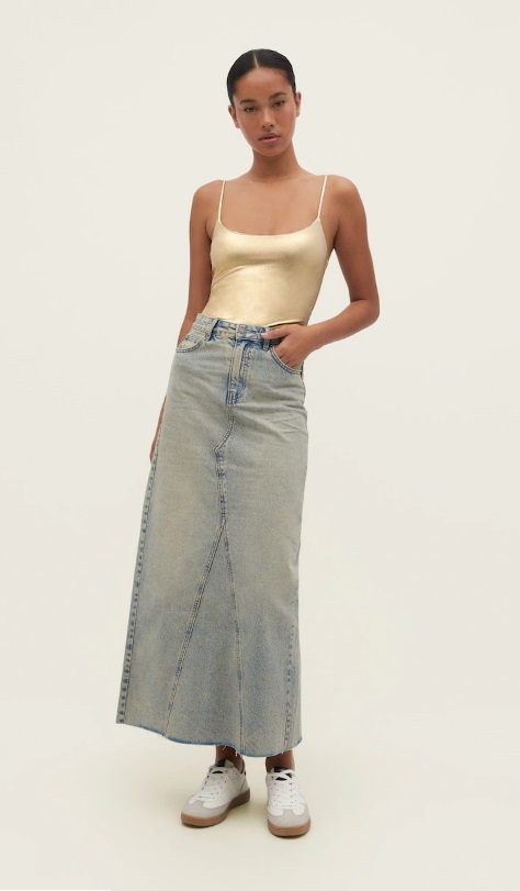 Letošní rok je rokem džínoviny. A jestli nějaký kousek opravdu výrazně vyniká, je to právě středně dlouhá denimová sukně, která si svou popularitu získala především díky své univerzálnosti. Můžete ji nosit téměř celý rok, ať už jsou tropy, nebo teploty klesnou, ale také se hodí téměř úplně ke všemu, a tak se velmi snadno kombinujte se zbytkem šatníku. Do karet ji také hraje fakt, že všichni touží po probuzení módy z devadesátek a přelomu milénia.