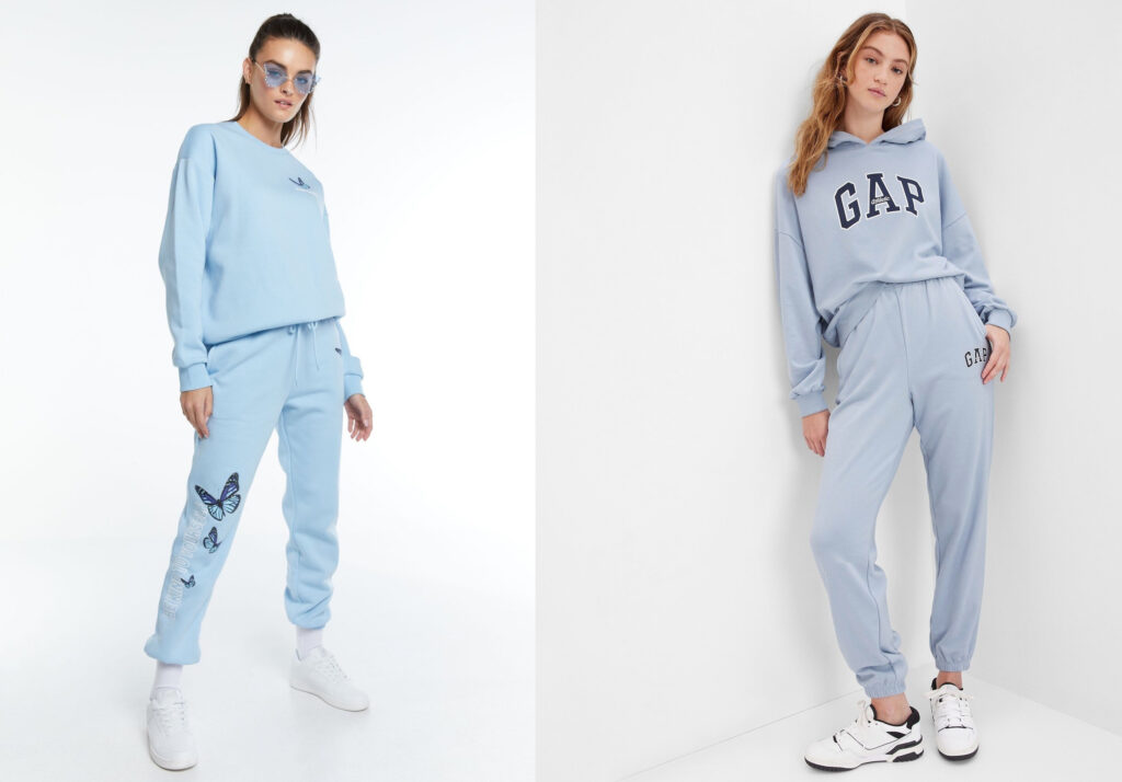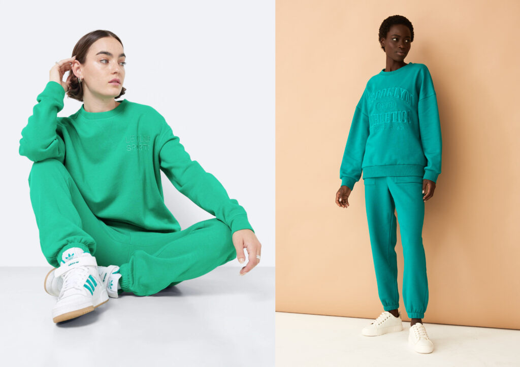 Zleva: mikina 589 Kč, tepláky 589 Kč, Noisy May (prodává About You); mikina 599 Kč, tepláky 599 Kč, F&F