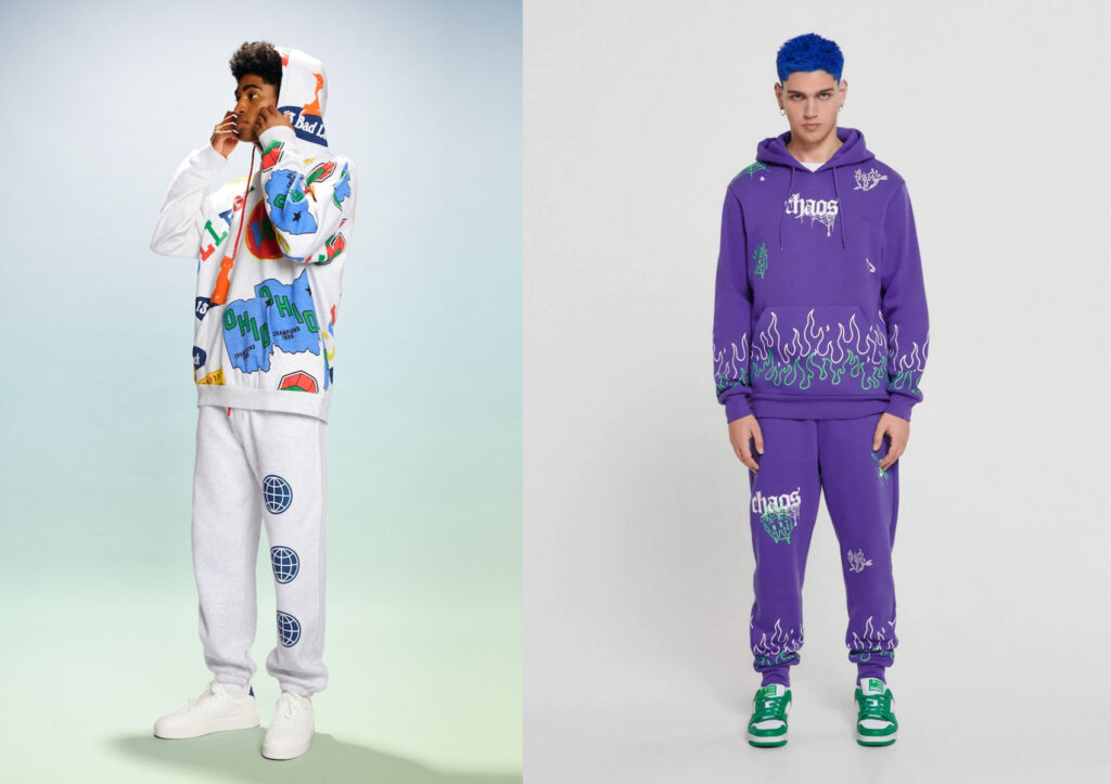 Zleva: mikina 749 Kč, tepláky 599 Kč, Bershka; mikina 799 Kč, tepláky 759 Kč, Cropp