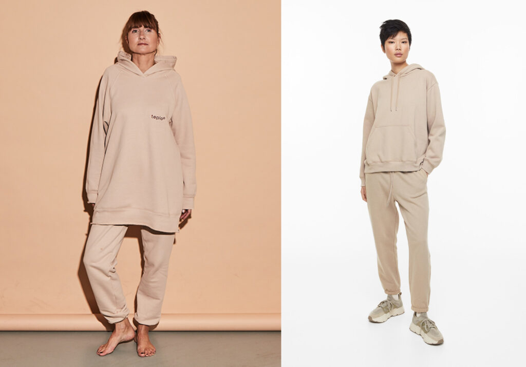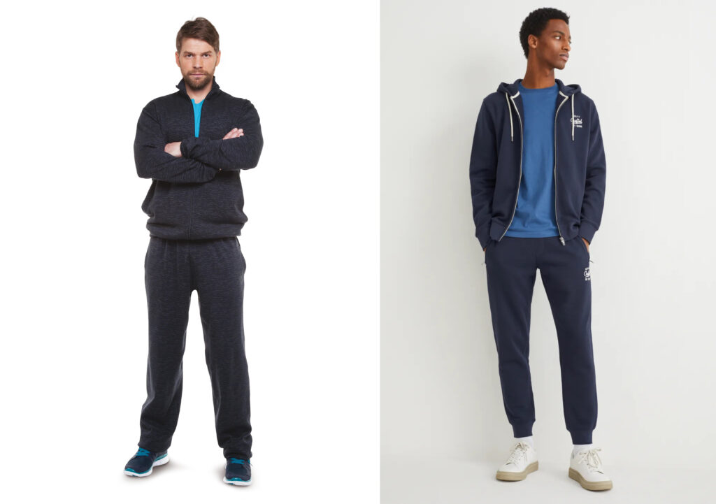 Zleva: mikina 1.899 Kč, tepláky 2.399 Kč, Teploo; mikina 399 Kč, tepláky 299 Kč, H&M