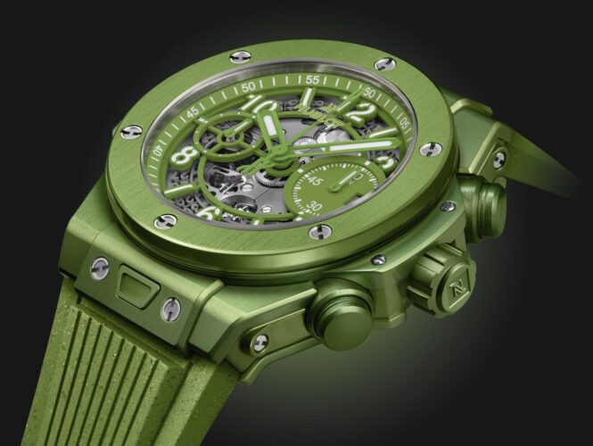 Model s názvem Big Bang Unico Nespresso Origin využívá recyklované hliníkové kapsle pro kávu Master Origin Peru Organic. Inspirovaný je proto také jejich výrazně zelenou barvou. Recyklované kapsle Nespresso pak tvoří třetinu recyklovaného hliníku, který byl použit na pouzdro hodinek. Udržitelnost se zrcadlí i v dalších aspektech. Můžete si vybrat ze dvou řemínků. Ten gumový obsahuje kávová zrnka a recyklovaný kaučuk. Textilní řemínek je zase z 95 procent z recyklovaného polyesteru. Nechybí detaily, jako malé N na korunce hodinek.