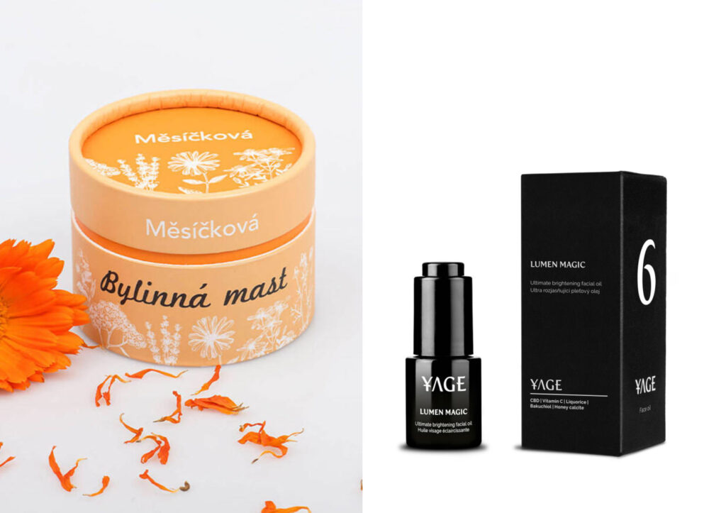 Zleva: ručně vyrobená mast s měsíčkem macerovaným v sádle v kombinaci se včelím voskem je to pravé na chladné zimní počasí Herba Roja, 490 Kč; směs 16 vzácných olejů proniká hluboko do pokožky, kde ji vyživuje a CBD v oleji zklidňuje podrážděnou pokožku od mrazu Yage Organics, 1.699 Kč