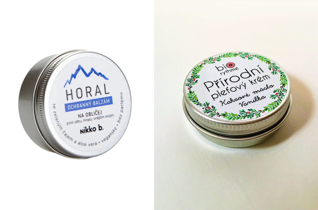 Zleva: neparfémovaný univerzální ochranný balzám na obličej a tělo do náročných podmínek můžete použít na pleť proti mrazu a větru i na tělo proti puchýřům a otlakům Horal Nikko B., 260 Kč; multifunkční balzám s bambuckým i kakaovým máslem a vůní vanilky Biorythme, 329 Kč