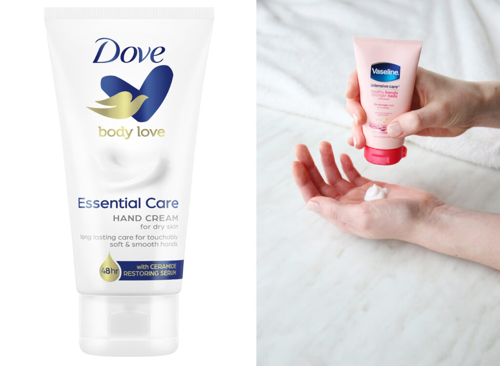 Zleva: krém na ruce s obsahem ceramidového obnovujícího séra dodá hloubkovou výživu a hydrataci Dove, 80 Kč; intenzivní a rychle vstřebávající se krém na ruce i nehty s keratinem Vaseline, 100 Kč