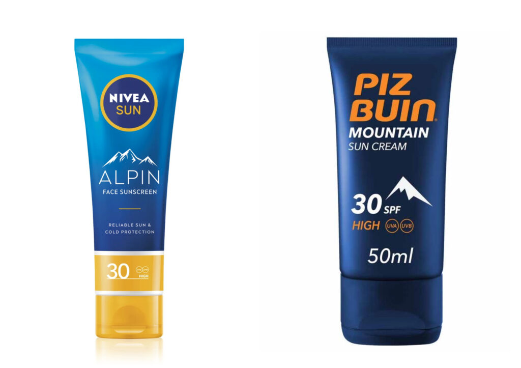 Zleva: hydratační krém s ochranným faktorem SPF 30 je ideální do slunného, chladného i větrného počasí Nivea Sun Alpin (prodává Notino), 216 Kč; hydratační krém s ochranným faktorem SPF 30 je odolný proti vodě i potu a hodí se každému snowboarďákovi i horolezci Piz Buin Mountain Cream (prodává Douglas), 329 Kč
