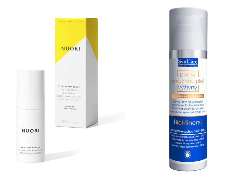 Zleva: hydratační sérum zklidňuje a hloubkově hydratuje pleť a zároveň působí na vznikající i stávající viditelné známky fotopoškození NUORI (prodává Madeformoms), 1.490 Kč; bohatý krém kombinuje výživné vlastnosti s ochranou a hydratací pokožky SynCare, 459 Kč