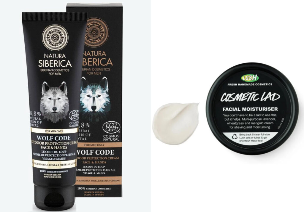 Zleva: pánský krém na obličej a ruce chrání pokožku před chladem, větrem, suchem a dalšími negativními vlivy prostředí Natura Siberica, 179 Kč; ochranný pleťový krém je ideální i pro zklidnění pleti po holení Lush, 670 Kč