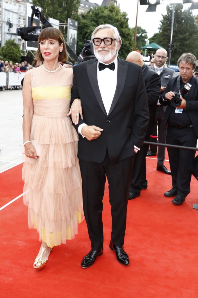 Prezident Mezinárodního filmového festivalu Karlovy Vary Jiří Bartoška s chotí Andreou vypadali opravdu elegantně. Na skvěle padnoucím obleku nebylo co vytknout. Paní Andrea vyšla v tylových šatech tělové barvy s krajkovými detaily žluté barvy z dílny Dolce & Gabanna.