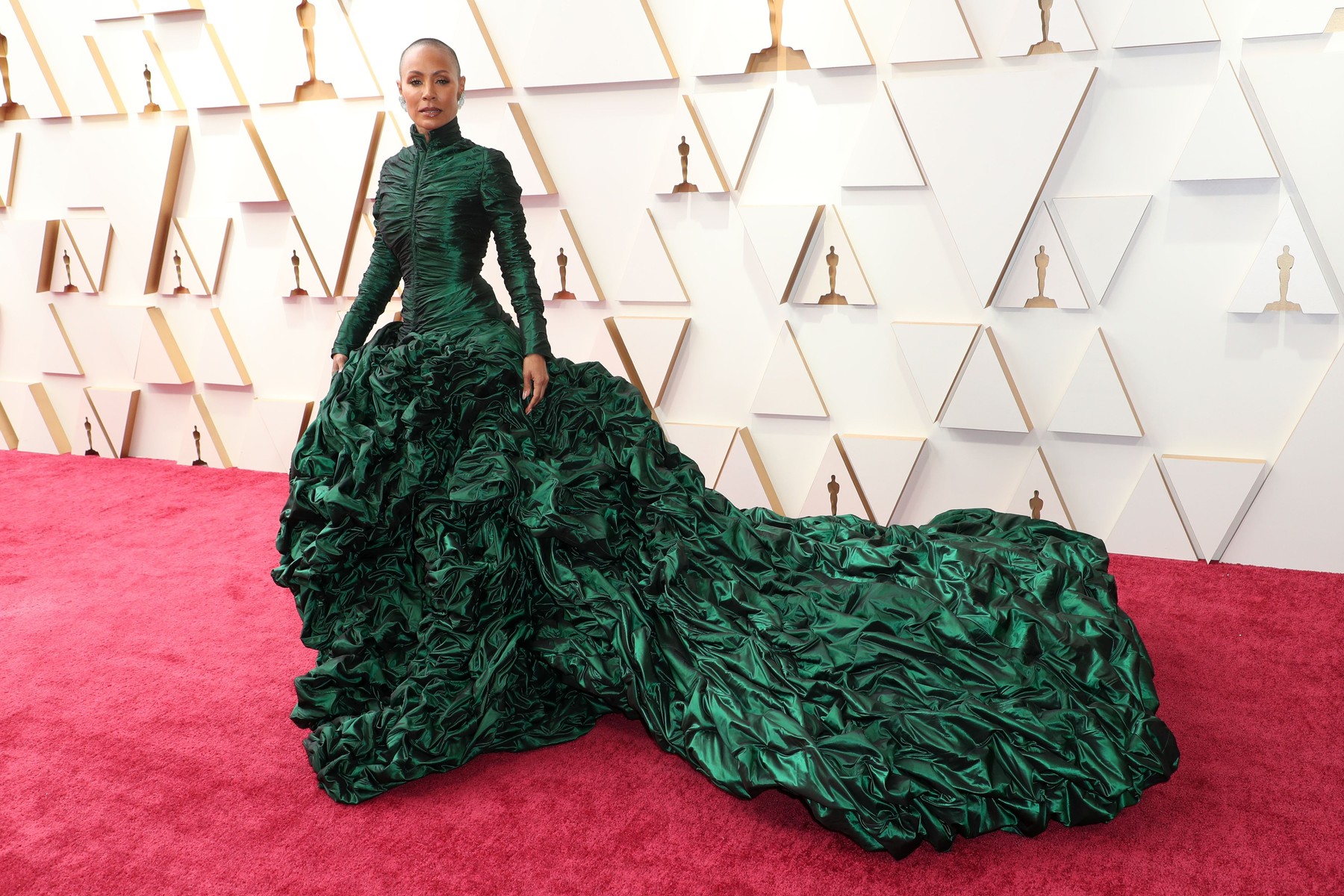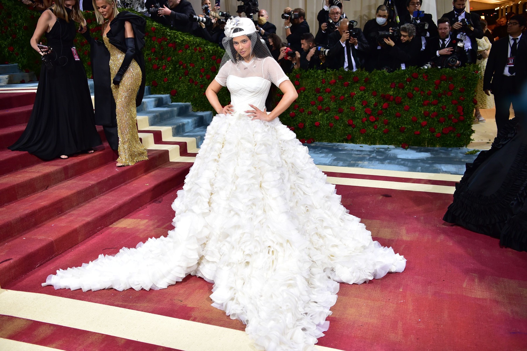 Róba posetá blyštivými kamínky vznikla v dílně francouzského návrháře Jeana Luise a Kim Kardashian kvůli ní musela zhubnout 7 kg za tři týdny. Jenže ani tak jí úplně nepadla. Aby si toho veřejnost nevšimla, vzala si na červený koberec šikovného pomocníka. Bílý kožíšek chytře zamaskoval nepadnoucí velikost. Mimochodem originál šatů měla Kim Kardashian jen na červeném koberci. Poté, co vyšla schody a ukázala se fotografům, převlékla se do věrohodné repliky.