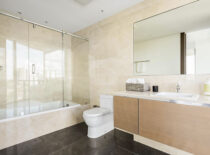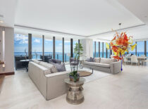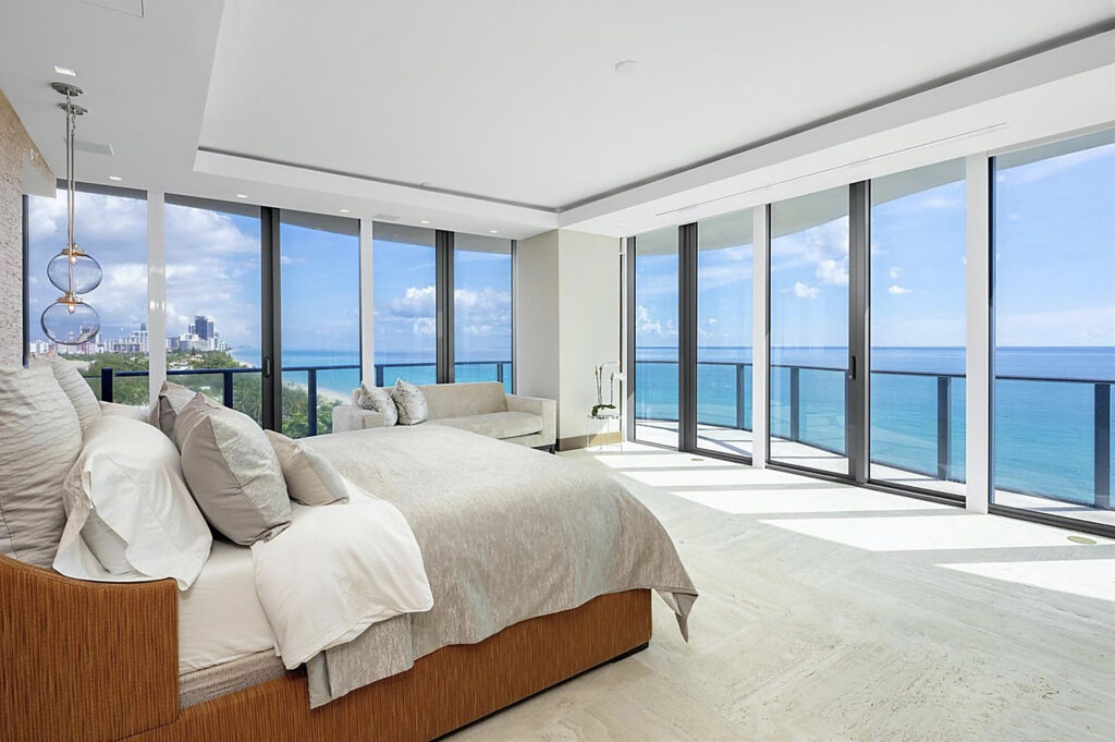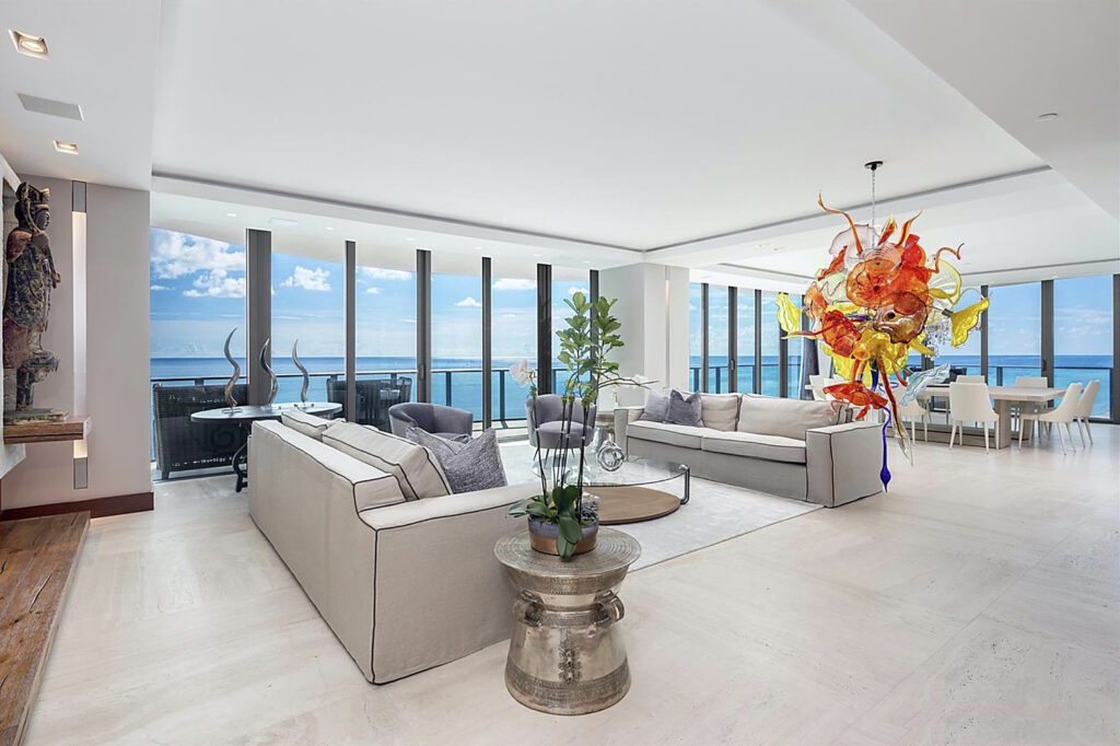 Byt je samozřejmě vybaven i exkluzivním nábytkem. Interiéru ve výmalbě dominují převážně světlé barvy, které ladí s nábytkem i s podlahou a koberci. Tmavé prvky jsou v jednotlivých místnostech decentně rozmístěny tak, aby nenarušovaly harmonii celého bytu. Do tmavých tónů je taktéž designován obrovský barový či snad snídaňový pult s vlastní vinotékou. Naopak výrazněji se designéři vyřádili v pokoji pro hosty, v němž jsou stěny vymalovány cihlovou barvou. V koupelně zase najdeme samostatně stojící vanu, z níž lze, ostatně jako z téměř všech míst v bytě, pozorovat Atlantský oceán a pobřežní dění.
