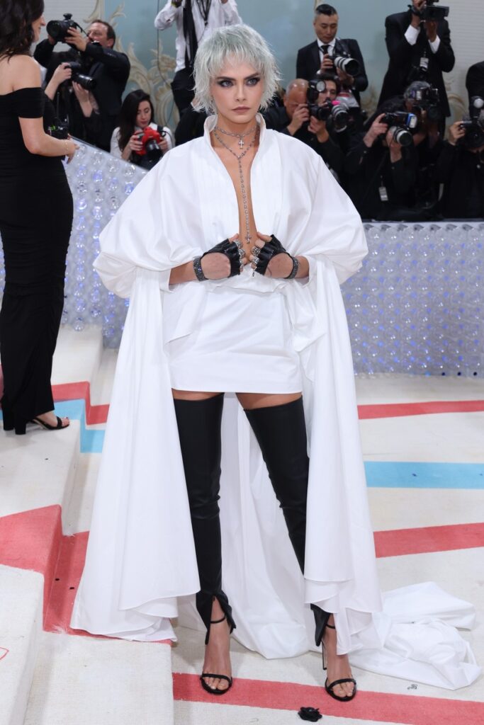 Na letošním Met Gala pochopitelně nechyběly největší múzy Karla Lagerfelda. Dorazila Carla Bruni, Naomi Campell, Gisele Bündchen, Margot Robbie, Kendall Jenner, Gigi Hadid a samozřejmě Cara Delevingne. K vidění bylo mnoho vintage modelů, ale také tradiční módní prvky, které budou navždy spojovány s tímto módním géniem. Nebyla tak nouze o bílé košile, černobílou kombinaci barev, školácké límečky, rukavičky, perly, mašle, zlaté řetězy, nebo květiny, konkrétně Karlovy milované kamélie. Odkazovalo se i na jeho největšího miláčka, kočku Choupette, která mu byla nejen rodinou, ale i obrovskou inspirací.