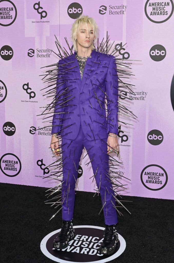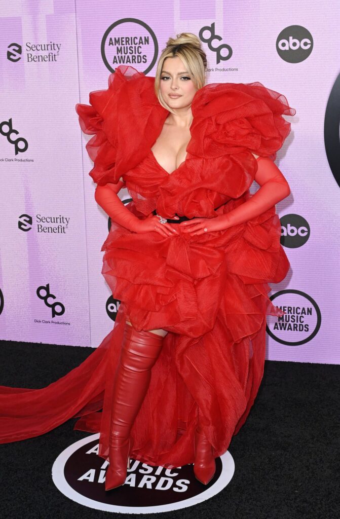 Vládkyně letošních American Music Awards Taylor Swift červený koberec vynechala, na ceremoniálu se objevila ve třpytivém zlatém overalu s odhalenými zády. Známý provokatér Machine Gun Kelly opět vsadil na extravaganci, oblékl se do tmavě fialového obleku s ostny od značky Dolce & Gabbana. Anglická zpěvačka Ellie Goulding zvolila crop top s křišťálovými korálky se sukní a návleky na paže z kolekce Philosophy di Lorenzo Serafini jaro-léto 2023. Newyorská rodačka albánského původu Bebe Rexha na sobě měla objemné červené šaty značky Buerlangma s obřími rameny a dlouhou vlečkou. Pink chodila po červeném koberci se svou rodinou v černo-zlatém třásňovém vintage kousku, o kterém na Instagramu prozradila, že je vypůjčený od Boba Mackieho a Cher. Meghan Trainor oblékla výrazný a energií nabitý růžový flitrový oblek od Michaela Costella. Členové populární kapely Imagine Dragons tentokrát vynechali košile a dali přednost rozevlátějšímu stylu. A italští vítězové loňské Eurovize, Måneskin opět nezaváhali a vsadili na svou pověstnou extravaganci. V oblecích s podvazky byla tato čtveřice nepřehlédnutelná.