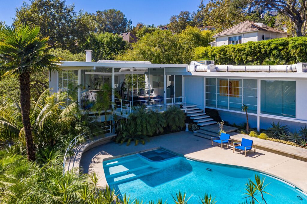 Bradův současný domov vytvořil v roce 1960 architekt Neil. M. Johnson. Ocelový dům se mu přezdívá proto, že je vystavěn na ocelové konstrukci obložené obrovskými skleněnými panely, přes něž je vidět na téměř celé Los Angeles. Půdorys do písmene L dodává domu jednoduchost a zároveň umožňuje mít ve svém středu obrovský bazén, který lemují tropické rostliny připomínající hotovou džungli. A co dalšího v nové domácnosti Brada Pitta najdete? Součástí domu je vířivka schovaná za hustými sekvojemi, sauna, několik útulných krbů a velká terasa. Dům je vybaven hned třemi ložnicemi s prostornými šatnami a jednoduchým nábytkem. Dominantou obytných prostorů jsou ale hlavně pestré barvy, například v ložnici se nachází zářivě modrý koberec, obývací části zase dodává tu správnou atmosféru modro-červený vzorovaný koberec, modré sofa a pohodlná zelená kožená křesla. Z většiny pokojů je rovněž výhled na bazén a terasu.
